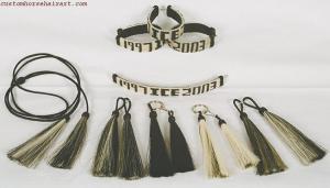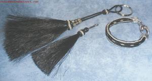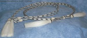 By collaborating with other local artists who work with leather, wood and silver, she can incorporate horsehair designs into bridles, belts, blankets and jewelry. Recently she worked with a wood carver to create 2 Spirit Horse Sticks for an Arizona client.