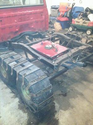 Then he went on Craigslist and bought a pair of rubber cleated tracks and a tag axle designed for ATVs. He lengthened the axle by 2 1/2 ft. to match the pickup and made spacers to adapt the ATV's 4-bolt wheel pattern to the pickup’s 6-bolt wheels.