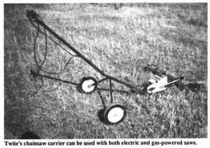The carrier he built can be used for any kind of saw. It's made out of square steel tubing with a length of round pipe for a handle. The Y-shaped lower frame is fitted with 16-in. dia. rubber wheels spaced 30 in. apart. A clamp through the saw handle holds it in place. The cart can be used with either gas or electric saws. When Twite uses it with his Sears electric saw, he wires it through a "trigger" switch on the handle so he can start and stop without letting go of the handle. With a gas-powered saw, Twite can put a 1-gal. gas tank on the frame of the cart to increase the running time of the saw.