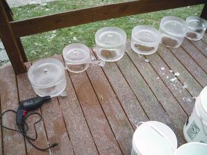I make them by filling a plastic bucket 3/4 full of water and then letting it sit outside overnight so the water partially freezes. In the morning I place the bucket on its side, pour water over it, and slide the ice chunk out. It’s still open in the middle and at the bottom but has about a 2-in. thick layer of ice on top and along the outside. I place the chunk upright, then use a spade bit to drill a 1 1/2-in. dia. hole on top. I set the candle in a small piece of cardboard on the ground and then place the ice chunk over it. Then I use a barbeque grill lighter to light the candle.