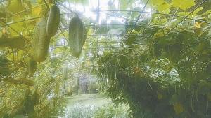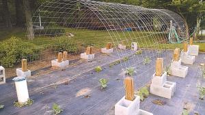 The second idea Chuck passed along is a simple way to make trellises out of 16-ft. long cattle panels. He staples the ends to chunks of 4 by 4’s and then inserts them into cement blocks. He sets them up so they’re about 5 1/2 ft. tall at the peak. Cucumbers and beans hang down inside, making them easy to pick. At the end of the season, he can easily stack the trellises alongside the garden.
