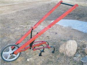 State-Of-The-Art Walk-Behind Cultivator CULTIVATORS “I tried using a couple of different commercial walk-behind cultivators to break ground for my garden but the tines were spaced too close together and plugged up on sod clumps weeds and roots So I finally decided to build my own walk-behind cultivator that won’t plug up ” says Perry Gingerich Wadena Minn His cultivator covers a full 15-in working width and has 3 rows of shanks with 3 1/4-in wide shovels welded onto them There are 2 shanks on the front and back rows spaced 10 in apart and one shank in the middle All shanks bolt onto a rectangular flat iron frame that’s bolted to a short length of square tubing “Most walk-behind cultivators have narrower shovels with about a 1 1/2-in gap between them that never gets touched The shovels on my cultivator are tapered and lay flatter with the ground so there’s no gap between them ” says Gingerich The cultivator rides on a single wheel on front and has wooden handles with a pipe connecting them on back “The design lets you push against the pipe with your stomach and your whole body whereas with other walk-behind cultivators you have to push everything with your wrists and shoulders which is harder to do ” says Gingerich But he says the cultivator’s best feature is that it has built-in “weed pullers” - a pair of V-shaped slots notched into each side of the point “If the weeds just bend out of the way as I move forward without coming out of the ground I can back up and the V-notch on either side of the shovel will catch them and pull them out ” says Gingerich “Sometimes the notch just cuts through the weed’s root but other times it catches on the root and pulls it right out of the ground I’ve had very good results with it “I used my cultivator last year for the first time and had very few problems with plugging and very few weeds that I couldn’t pull out ” By pulling a pin Gingerich can remove all the shovels and attach a 2-row marker which he can adjust anywhere from 18 to 36 in wide He also built a row marker attachment with 2 shovels on it It installs by unbolting the frame that holds the shanks and shovels from the square tubing and bolting the frame of the row marker attachment in its place “I’m thinking about making more attachments for my cultivator including a pony hitch but I don’t have anything on paper yet ” says Gingerich who notes that he’s willing to build the cultivator for others and can make it with 4 shovels instead of 5 The 5-tine model sells for $170 and the 4-shovel for $160 The row marker sells for $25 and the pony hitch for $12 All prices are postage paid Contact: FARM SHOW Followup Perry Gingerich JR’s Sandblassting and Painting 30225 610th Ave Wadena Minn 56482
