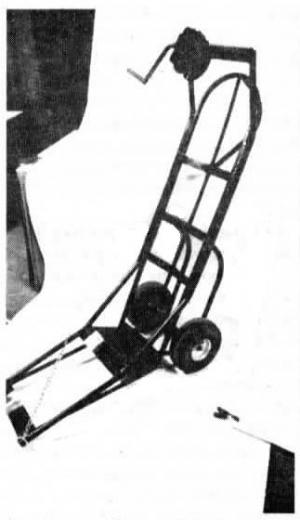 Brauer simply extended the lower portion of a "hand truck" or 2-wheel dolly. He reinforced the weight-bearing sides with 3/4-in. dia. pipe, added a winch, cable and chain, and installed 6-in. dia. pneumatic tires which roll much easier than hard rubber tires, he says. To load the hog Brauer fastens the chain around the hog and uses the winch, mounted on the handles, to pull it onto the hearse.