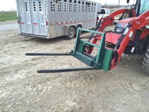 “Hauling up to 8 bales at a time saves a lot of wear and tear on your tractor and greatly increases your hay handling production. It also works great for other jobs. For example we’ve used it to move pallets, feed troughs, Rubbermaid water troughs, and cattle panels. Will has even used it to lift a 4-wheeler off a truck flatbed and move it into our shop to replace the engine. He positioned one fork on front of the 4-wheeler and one on back and then squeezed one arm inward.”