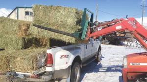 “Powered” Bale Fork Squeezes Loads From The Side BALE HANDLING “Our new loader-mounted bale fork is designed with squeeze arms that handle small square bales from their ends or sides which makes it great for stacking It’ll work on small tractors and skid loaders picking up a block of 8 bales at a time ” says Cheryl Hall Paradise Valley Nevada The “Lil Squeeze” bale fork has a 1 250-lb capacity and comes with a telescoping-tube design It consists of a pair of squeeze arms attached to a 6-ft long rectangular steel backstop which mounts on tractor loader arms in place of a bucket The squeeze arms are made from 3-in steel tubing One arm is stationary An enclosed hydraulic cylinder moves the other arm inward to grasp the bale in a tight hug “It’s a simple cost efficient way to move bales We use the heck out of it on our farm ” says Hall who along with her husband Will is in the custom haying business “There are commercial bale squeezes for round and big square bales but as far as I know none for small square bales We often use it on our Massey Ferguson 1250 25 hp tractor “Hauling up to 8 bales at a time saves a lot of wear and tear on your tractor and greatly increases your hay handling production It also works great for other jobs For example we’ve used it to move pallets feed troughs Rubbermaid water troughs and cattle panels Will has even used it to lift a 4-wheeler off a truck flatbed and move it into our shop to replace the engine He positioned one fork on front of the 4-wheeler and one on back and then squeezed one arm inward ” Hall suggests calling for specific pricing information Contact: FARM SHOW Followup Will and Cheryl Hall P O Box 12 Paradise Valley Nevada 89426 ph 775 578-0008 or cell ph 775 304-3240; hallnhay5@gmail com