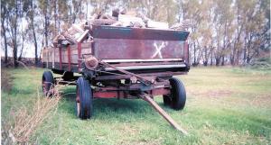 The silage box trailer is 14 ft. long, 7 ft. wide, and has 2-ft. high sides. It still has the original wooden floor and apron chain. The original wheels were worn out so Reibsamen replaced them with the rear steering wheels off a pair of old Massey combines.