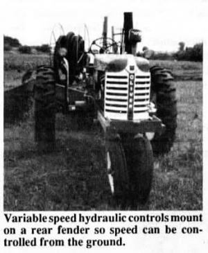 To convert to hydrostatic drive, they first cut off the belt-drive pulley on the side of the tractor and replaced it with a 1-ft. dia., 60-tooth sprocket. The sprocket is chain-driven by a hydraulic motor mounted on the tractor frame just ahead of the sprocket. The hydraulic motor is driven by a 27 gpm 3-pt. mounted pto hydraulic pump. To power the tractor, they simply put the belt drive in gear, lock the clutch down and turn on the pto. With the engine running wide open, the tractor has six gears that range in speed from 2 to 12 ft. per minute.