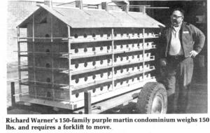 Purple martins, largest of the swallow family and a voracious insect eater, depend on man to provide homes. Richard Warner, of Charleston, Ark., got ready for them this year before they came back in the spring by building a condominium that will house 150 purple martin families.