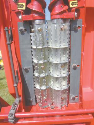 There are 2 overlapping stalk rolls per row, one smaller than the other. “The rolls run at different speeds which results in shredding action that opens the pith of the stalk from top to bottom, compared to other stalk shredding rolls that rely on close tolerances between the rolls to make cigarette butt-type pieces that can only break down from each end.