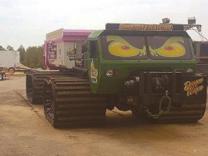 The chassis was built completely from scratch with an articulated steering joint at center. The cab is off an old Army tank retriever, and the dump box sits on its frame. Dunneisen built the tracks using steel, rubber belting, and UHMW plastic and attached wooden slats to the tracks for maximum traction.