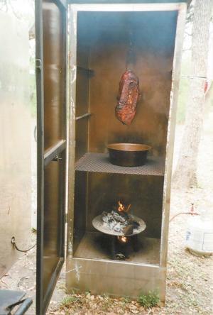 The burner sets on the floor underneath a circular steel pan and hooks up to a propane bottle located outside. Wood chips placed on the pan provide the smoke and heat. The meat hangs from a hook bolted to the smoker’s ceiling.