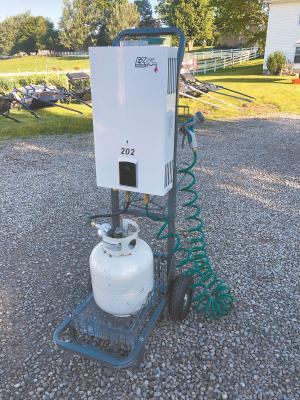 Propane-Powered Portable Tankless Hot Water Heater CLEANING EQUIPMENT “Our new portable tankless hot water heater rides on a 2-wheeled dolly and operates off a standard 20-gal propane tank It comes with a 25-ft coiled flexible hose and spray nozzle allowing you to wash objects with hot water anywhere there’s water pressure ” says inventor Atlee Yoder Trail Livestock Millersburg Ohio “You can even take a hot shower with it while camping An optional 12-volt water pump can provide you with hot water even if you don’t have water pressure ” The E-Z Tankless water heater comes with a metal basket on front to store the propane tank which hooks up to a gas burner inside a tank that’s used to heat the water Cold water travels through a standard garden hose that hooks up to an inlet at the bottom of the tank “Amish farmers in our area use it to wash off horse buggies but it also comes in handy for many other jobs such as cleaning livestock barns and washing vehicles driveways and so forth Some people take it to fairs where they use it to wash livestock or clean trailers ” says Yoder “The optional 12-volt water pump is operated by a battery that rides alongside the propane tank It comes in handy when you want to pull water out of a creek ” Water can be heated up to about 140 degrees Fahrenheit but the temperature can be adjusted The unit provides up to 4 gpm “A 20-lb propane tank will last 5 to 10 hrs depending on how much water you use ” says Yoder The E-Z tankless water heater without the 12-volt water pump sells for $599 plus S&H The pump sells for $212 plus S&H; $245 with pump and battery Contact: FARM SHOW Followup Trail Livestock 6205 TR 419 Millersburg Ohio 44654 ph 330 893-3723; fax 330 893-0577