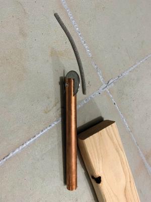 Using his hand-held grinder with a metal cutting disk, Prose cut a 1/4-in. wide slot about 1 in. deep into the end of a piece of 3/4-in. dia. copper tubing. Then he mounted a 1 1/2-in. dia. washer in the slot, securing it with a 1-in. long sheet metal screw.