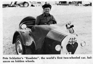 Detroit will probably never be interested, but Pete Schlatter of Francisville, Ind., hasn't let that bother him. He invented the world's first two-wheeled car strictly for his own enjoyment.