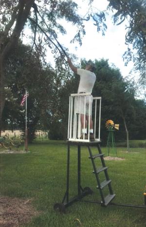 The 2-ft. square platform is 4 1/2 ft. off the ground. “That’s a little shorter than a 6-ft. step ladder. However, the staircase’s 6-in. wheels are solid steel and don’t flex like rubber tires would,” says Hettler. “Also, the wheels and axle are much wider than the ladder. As a result, the staircase doesn’t move at all when I’m standing on the platform and using my gas-powered pole pruner. I can reach almost 20 ft. high.”