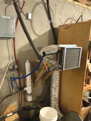 Water runs through the system at the pump’s lowest setting, about 5.2 gpm. A thermostat that runs from the radiator fan to the hot water pipe turns on the fan when the water temperature reaches 150 degrees. Hot air is blown out through a 6-in. piece of flexible heat duct.
