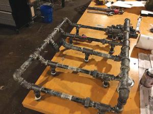 He made the grate out of 3/4 and 1/2-in. dia. black pipe, forming it into a grid using T-joints and elbows, with short lengths of capped pipe as legs. Water enters the grate through the 3/4-in. crosspipe at the front, is pushed through the 1/2-in. “capillary” pipes that run to the rear manifold, and then exits through an outlet at the front. Pipes come up through the ash dump hole at the front of the fireplace. He runs 3/4-in. PEX pipe from there to the pump and radiator.