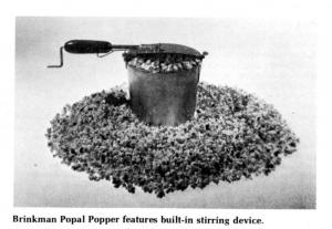 "Stirring the corn makes it different from all other poppers," says Emery Brinkman, inventor-manufacturer. "Kernels pop larger if stirred while popping - gives you the same results as commercial poppers. No hard centers and very few old maid kernels left in the pan."