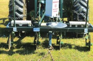To scatter seed, Brown avoided motors and went with a vibration driven Yeoman’s Shankpot seeder. The Australian made seed box costs around $600 and is designed for use behind a plow. Dial up seed slots of 5/8-in. to 1 1/16-in. allow about any size seed to vibrate out of the seed box onto an 18-in. disk that scatters it behind the coulters. A patented jigger system prevents seed from clogging up the seed drop.