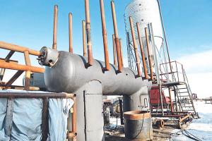 To start the process, his old Cockshutt 1850 tractor runs a stripped-down combine and swather to tear apart scrap plastic. Pieces are blown out and fed into a telescoping extruder that extends inside the super-heated burner made from an old anhydrous tank. Various sizes and lengths of used oil pipes extend up and out of the long tank to control heat and provide ventilation.
