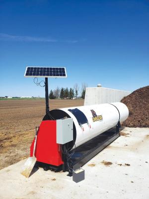 Co-owner of Smart Ag, Bert Meijering, says the idea for the futuristic composter came about during conversations with customers at an international poultry show in London, Ontario. Bert and his co-owner put their heads together and came up with the solar-powered cylindrical stainless steel tube model to handle poultry and hog composting.