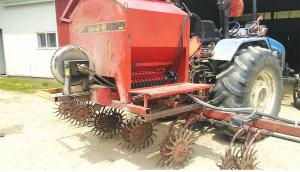 “We traded a load of cornstalk bales for a six-row rotary hoe, and we mounted a Gandy air seeder on it,” says Bergler. “The seed meter was ground drive originally. We converted to a hydraulic motor and later to electric, which is handier. It lets us control seeding rates with a rheostat wired on the tractor.”