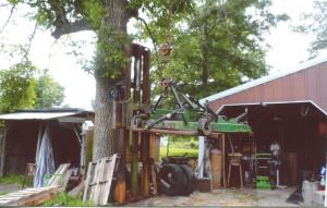 It’s easy for Marshall Berkoski to get under the equipment he’s working on with the help of an old forklift mast and a big tree. When his old forklift was vandalized to the point of no repair, Berkoski salvaged what he could. The vandals had broken off knobs, smashed dials, and removed levers.