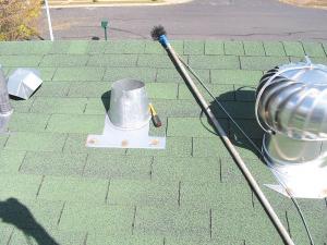 He reused a 20-ft. piece of pvc pipe left over from a construction project and taped the brush to the pipe to extend its length. Now he can get through the 18-ft. pipe to the roof without issue.