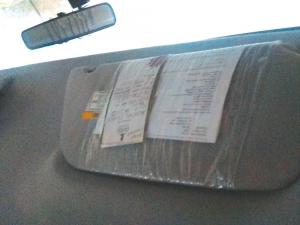 Third, Parks wrapped the left sun visor on his truck with the clear plastic that comes covering mailed magazines. He left the side ends open on each side to form a pocket that he can slip papers into it. So far, the plastic visor guard has proven helpful for staying focused and organized on the road. “I did this to keep from soiling the visor with my hands, but a side benefit is that I can keep my insurance papers on display as well as slip notes, receipts, and other papers behind the plastic. Everything is in plain view when driving,” explains Parks.