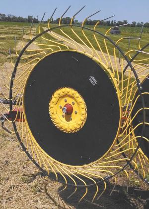Sueltz says the bands reduce damage in rough conditions. They also enhance the aggressiveness of the rake teeth in hay fields.