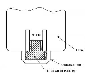 “The single barrel carburetor on these tractors has a nut with a screw-on insert thread at the bottom that holds the bowl in place,” says Henry. “Any water that condenses in the gas tank eventually ends up in the bowl. If the water freezes, the ice expands and breaks off the stem bottom, making the carburetor useless. A new single-barrel carburetor for these tractors can sell for $300 or more. The part I make allows you to rebuild the stem bottom. You machine off the bottom of the bowl stem, then screw in the thread repair kit. The original nut is used to hold the carburetor bowl in place.”
