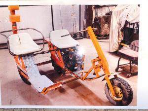 Brian built his scooter out of two Weber Weeders. “Almost every part on the scooter came from the two machines. After I finished building the scooter, I had parts left over, so I build a sidecar. The top and front are adjustable for the right pitch and camber.