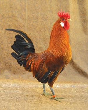 Unlike many chicken breeds, buttercup hens and roosters are different colors. Roosters are reddish-orange with black tails, while hens are golden with black spangles across their back. But what both sexes have in common are striking green legs with yellow feet.