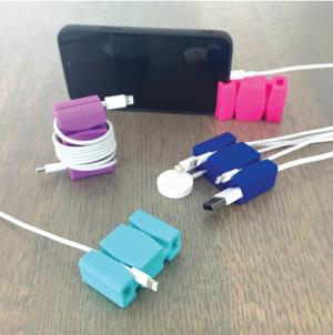 CordBrick is a non-adhesive, weighted cord holder made from silicone rubber (outside) and carbon steel (inside). It’s 2.30 in. long, 1.35 in. high, and .85 in. wide and weighs 3 oz. There are two spots on the top and bottom to hold cords (four total), and the ends can hold a phone as a stand or be used for cord wrapping. It’s designed to fit any cord used for phone charging.