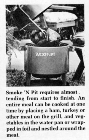 Latest new development in patio or outdoor cooking is the Smoke 'N Pit charcoal water smoker. It utilizes moisture, charcoal heat and smoke from aromatic hardwoods to cook meats and other foods "to a degree of tenderness and delicious flavor not possible with conventional cooking grills," says the manufacturer.