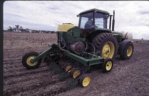 "It all started a couple years ago when we decided to switch our corn from 38 to 22 1/2-in. rows for the earlier canopy and better weed control that narrow rows offer. We'd been using a Deere 7000 four-row planter but the ripple coulters we'd added ahead of its double disc openers threw a lot of mud at us in wet years. Plus, hair-pinning was a real problem in some of the heavy wheat stubble we plant into," Gillen ex-plains. "We could have mounted a Cyclo unit on our Deere 750 drill like some no-tillers, but we would have been wearing two thirds of the openers needlessly if we'd blocked off two of three openings to get the 22 1/2-in. spacings we wanted. Plus, we would have been stirring up more soil and possibly causing more weeds to germinate than we do this way."