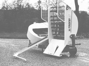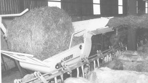 It loads itself so no second tractor is needed. The bale bed tilts up 90? and a side arm pulls a bale on board as the bed drops back down. A chain fitted with cutting knives rotates the bale and pulls off the hay or straw.