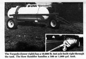 Two models - the Row Rambler and the Torpedo - are both equipped with single front wheels. The Torpedo, with no exterior framework, has a 10,000 lb. test axle which is built right through the tank. Two large, easily adjusted rear tires provide extra-high crop clearance.