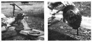 He made the blade holder out of 1 1/2-in. wide flat steel with a spindle that holds the blade, sandwiched between two 5 1/2 in. dia. 1/2-in. plywood circles. A hand tightened hold-down bolt holds the blade tight and can be quickly loosened to rotate the blade.