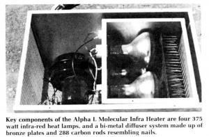 "Air molecules are energized, polarized and activated with infra heat," the manufacturer explains. "In this way, utilizing the energy of the infra-red wave length, the molecular heater uses a minimum of electrical energy to heat a maximum of space. The principle is similar to the heating rays of the sun and takes advantage of the basic characteristic of air to reduce heating bills, eliminate cigarette smoke, and to maintain even heat between ceilings and floors, and from wall to wall, without the usual heat pockets or hot spots."