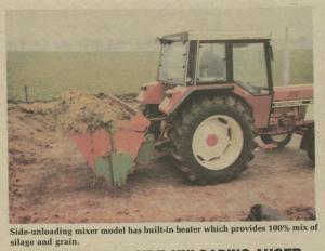 His company's new feed bucket mounts on either the tractor 3-pt. or can be mounted on the tractor loader. It pivots flat to the ground for loading, much like a conventional loader bucket, then pivots upright to carry its load. An unloading auger in the bottom of the bucket unloads feed to either side of the bucket into bunks or onto the ground.