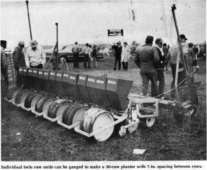 Some farmers are using the same unit to plant corn in 7 to 10 in. rows, harvesting it with a six-row header and driving as if it were solid seeded. Some operators plant a solid bank of corn or soybeans in rows spaced 7 to 10 in. apart; others use the narrow row spacing but skip a space wide enough for the rear tractor tires to go through. Another alternative: Use a solid bank of planting units to plant soybeans in 7 to 10 in. rows, then remove every other twin unit to plant corn in twin rows with each pair of rows 10 in. apart and a 30 in. spacing between the pairs. In this case, the amount of corn normally planted in a single or conventional row is planted in the two twin rows (half the population rate in each row).