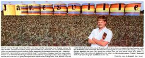 Town's colorful bins say hello to passers by GRAIN HANDLING Miscellaneous 14-5-36 Drivers passing through Janesville, Minn., receive a colorful welcoming from 10 grain bins on the edge of town. The once-silver bins, neatly spaced on the city's west end, are now home to a radiant yellow sun and multi-colored rainbow topped with neatly scripted letters spelling out "Janesville". Community representatives came up with the idea. Troy Doine, a Mankato State University senior, worked as an intern for the city's government and assisted in organizing workers. They used a power washer and boom truck to spray detergent on the bins to remove the graffiti. Next, the bins received a primer coat, then an oil base coat. To paint each stripe workers ran a pair of strings from the north end of the bins to the south end, then used small spray guns to paint between the strings. After they finished painting one color they moved the strings. Last, the bold, black letters were added. A Mankato State University arts student drew the letters to scale on graph paper. Workers then used chalk to project the graph and letters on the bin.
