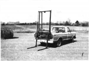 To transport a bale for a short distance, the mast can be left standing in the vertical position. To carry a bale over the road, the mast can be lowered, bringing the bale into the bed of the pickup.