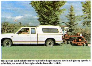 "I built it because I wanted a mower that was inexpensive to maintain and easy to tow. I liked it so much I decided to manufacture units for sale," says Eugene Keyowski, who farms and also owns a rental business. "I had been renting out a $10,000 riding lawn mower that was constantly breaking down. I wasn't making any money renting it out because I had to spend so much money on repairs. My mower sells for only $3,700 and is practically maintenance-free. One person can hitch it up and tow it behind any vehicle equipped with a ball hitch. You raise the deck up with a winch for transport. Mowing height is controlled by repositioning pins on both sides of the deck.