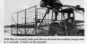 Called the Nicholas Bale-Throwing Arm, it works like a mechanical pitchfork in picking bales off the ground and tossing them, with a flip of a switch, into a high-sided trailing wagon.
