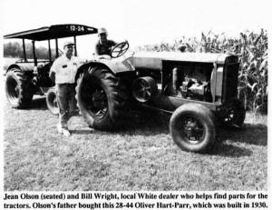 "I've always farmed exclusively with Oliver tractors. My first model, the one I started farming with, was a6-cylinder model 70 built in 1941. I'm also proud of a pair of 2-cylinder models, a 12-24 and an 18-36, made in about 1928. Hart-Parr tractors were first produced about 1905. I own several of them. My oldest Oliver is a Cletrac model built in 1919. I've never seen another one like it. Instead of having a Caterpillar tractor's leverage-type steering, it has a steering wheel that mounts straight up and down on a post. The Cleveland Crawler Tractor Company (Cletrac) became part of Oliver in 1944."