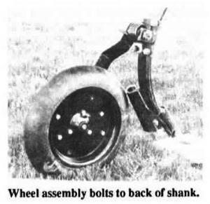 The wheel assembly bolts quickly to the back of any shank with four bolts. Down pressure can be varied with a simple adjustment. The pivot point has just one moving part - a replaceable neoprene bushing. If the air seeder shank trips, the wheel won't strike the framework of the machine. A variety of wheels are available to fit varying field conditions and operations, including double wheel assemblies.