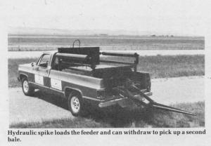 Stronski says the bale spike was the most challenging design aspect of the bale feeder since the spike has to be able to load the bale on the pickup and then withdraw to pick up another in the field. A special 2-cylinder design accomplished it. Stronski plans to mount a second spike-tooth bar on the other side of the pickup so bales can be unloaded on either side. The company plans to go into production on the new bale handler this fall. It will sell for $5-$6,000.