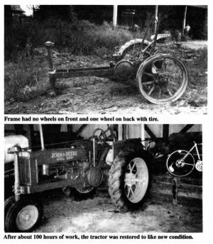 When Glenn Wiley brought home his latest antique tractor purchase, it sure didn't look like much. Nearly all the parts had been stripped off the tractor frame by the previous owner and were covered with rust. The frame itself looked like a broken down piece of junk with no wheels on front and one wheel on back with a tire and the other bare.